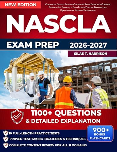 NASCLA Exam Prep 2026-2027: Commercial General Building Contractor Study Guide with Complete Review of All Domains, 10 Full-Length Practice Tests and 1,100 Questions with Detailed Explanations