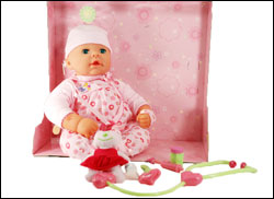 We enjoyed Chou Chou's life-like qualities, especially her authentic cry and giggle. And even though Chou Chou is somewhat of a "high-tech" doll, we are delighted with her traditional baby-doll touches: long-lashed eyelids that open and close; a soft body with firm rubber hands, feet, and head; and cute, removable pajamas. These touches offer fun, versatile, imaginative play on their own, keeping her from being limited to the "take-care-of-me" functions.