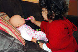 Put the pacifier in the doll's mouth, and she'll stop crying; the same goes with the thermometer, which also shows the doll's "temperature." Her fever will persist, however, until your child gives Chou Chou her medicine. Hold the medicine spoon to her mouth, and she'll make drinking sounds. Eventually, her fever will go away, and she will even laugh to show it. Chou Chou also laughs if you press her tummy.
