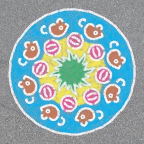 The Mandala-Designer is a beautiful way to help children discover and develop their creative side. Traditionally a spiritual symbol representing the universe, the mandala has become a common word to describe any ornate circular pattern. The kits entertain kids while also stimulating their minds and helping develop fine motor skills and a sense of accomplishment. Designed specifically for outdoor use, this kit gives children the freedom to work with a large surface instead of being confined to a small piece of paper, allowing them to dream big.