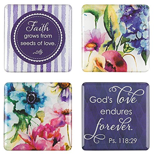 Our Inspirational Refrigerator Magnets are cheery, colorful and so functional. We all use the fridge as a household bulletin board for lists, messages, artwork and photos. These unique sets of 4 magnets will instill a spiritual lift each time. The glossy, epoxy-filled magnets are 1 7/8 inch square. The "Seeds of Love" Collection is a fresh floral range that expresses the love of God through inspiring Scripture and feminine designs.